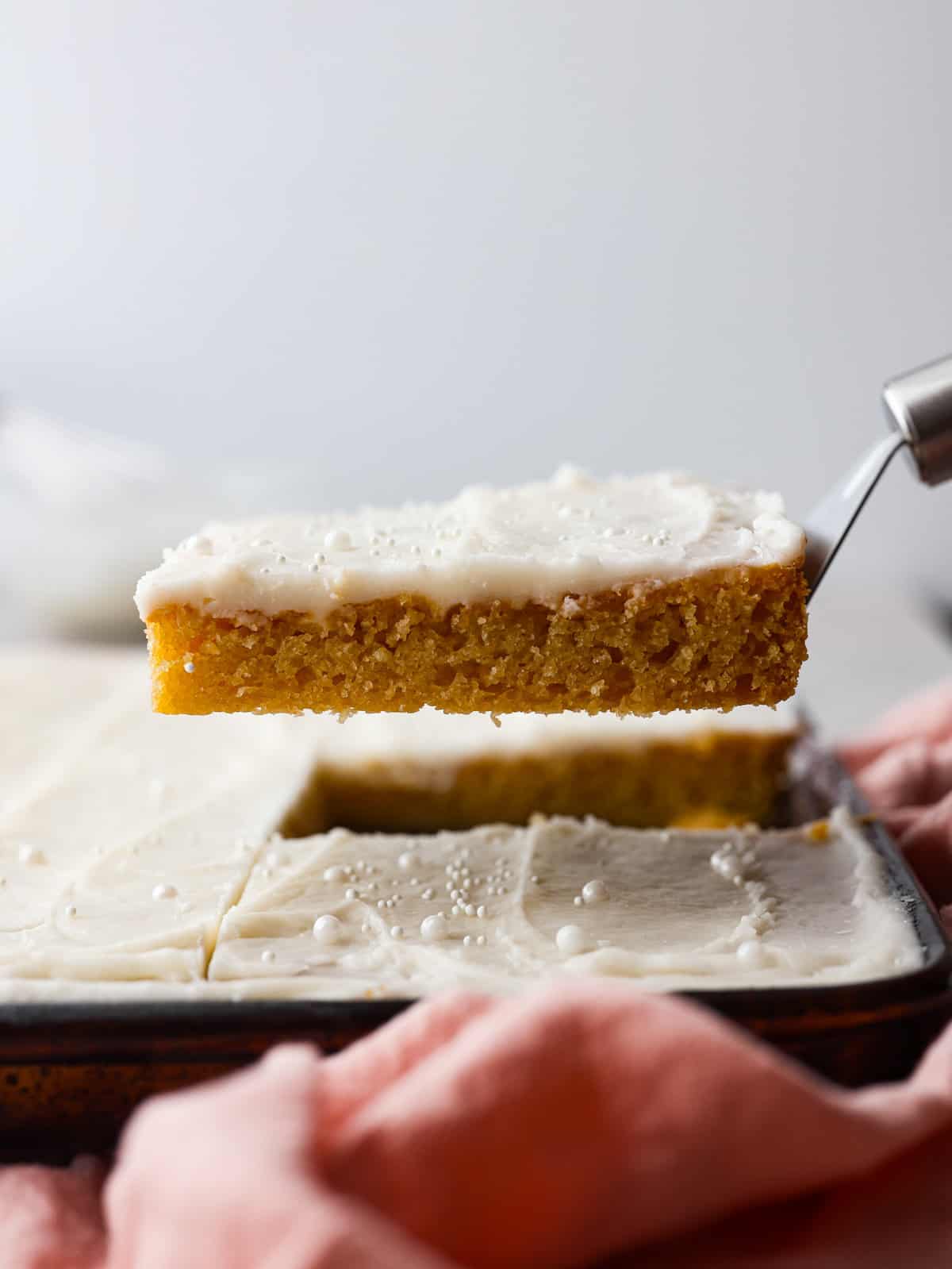 - Freezing: I would avoid freezing this cake because it is a sheet cake, and it can become harder to get slices out of the pan once it has been frozen and thawed.