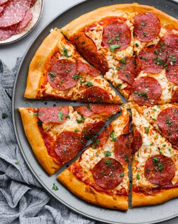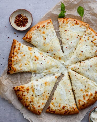 - Different Toppings: To keep this recipe simple I only made a cheese pizza, but you can add any number of toppings you would like! For proteins, try pepperoni, Italian sausage, bacon crumbles or grilled chicken! You really can’t go wrong with the veggies you add. Try adding chopped bell peppers, mushrooms, olives, spinach, arugula, corn, you name it!