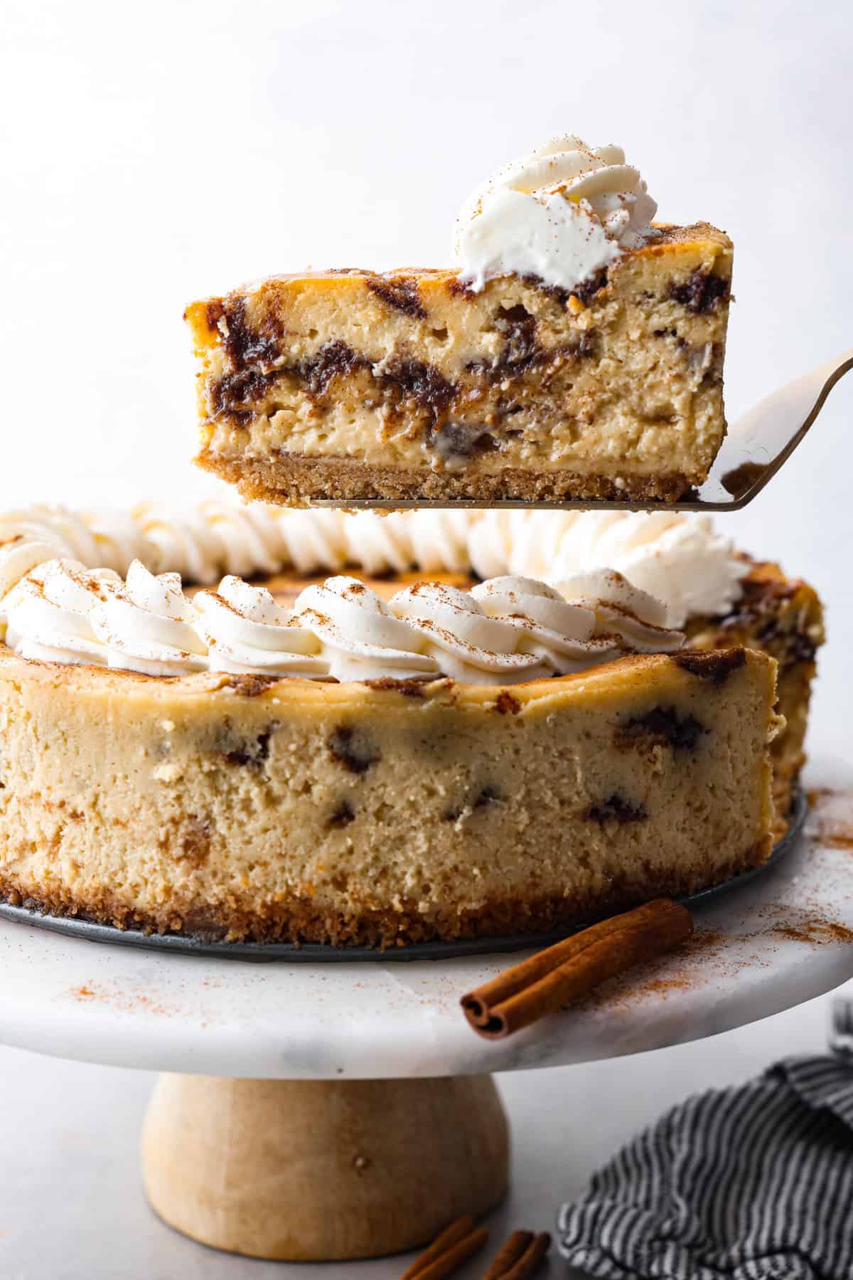 You will know your cheesecake is done when there is a slight wobble in the center. Do not stick a knife or a thermometer inside it or it will crack. Once it is done, turn off the oven then let it come to room temperature inside the oven. This takes about an hour but helps prevent it from cracking. Remove from the oven and place in the fridge for 6-8 hours or overnight.