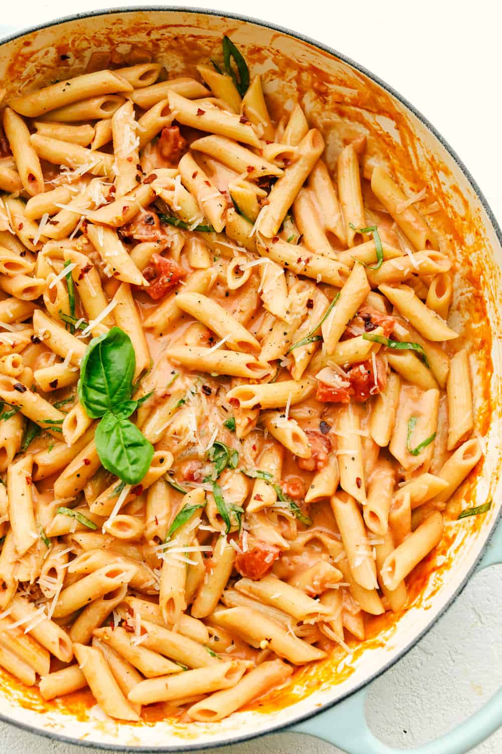 - Serve: Top the pasta with fresh basil, parmesan, and red pepper flakes if desired. Then serve immediately while it’s warm. Enjoy!