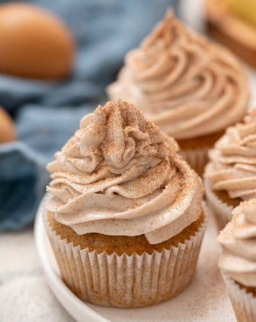 - Toppings: Pipe or spoon the whipped cream on top of each cupcake, then lightly dust with cinnamon and top with a couple of slices of strawberry or a maraschino cherry.